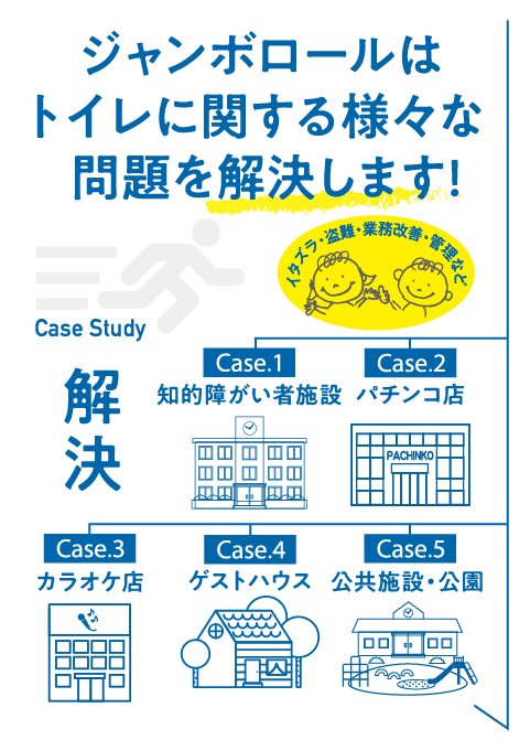 私たちは、トイレに関する悩みや問題を解決できる機能的なトイレットペーパー、ジャンボロールを提供しています。業務用トイレットペーパーとしても人気の「ジャンボロール」の長さは500m!通常の10倍もの長さがあるのでペーパー切れによる補充の手間を低減、盗難やいたずらによる損失が削減できます。いつものトイレットペーパーをジャンボロールに変更するだけで、様々な問題が解決します。ジャンボロールで皆さまが笑顔になりますように。