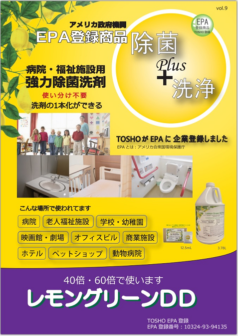 レモングリーンDDは、アメリカEPA(米国環境保護局)認定の最新の除菌洗浄剤です。2種類の第4級アンモニューム塩配合により、院内感染防止を目的に設計されたアメリカ病院グレードの除菌効果と、高い洗浄力がある日常清掃用の多目的洗剤です。
