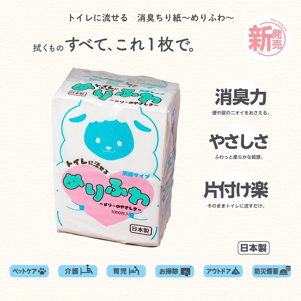 消臭ちり紙 めりふわ ~メリーのやさしさ~|水分に反応して消臭機能を発揮する、トイレに流せるちり紙