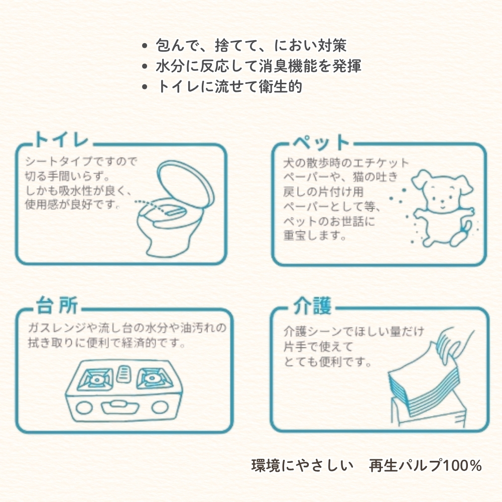 排泄物などを包んで捨てる際のにおいが気になる場面に配慮し、水分に反応して消臭機能を発揮するのが特長です。